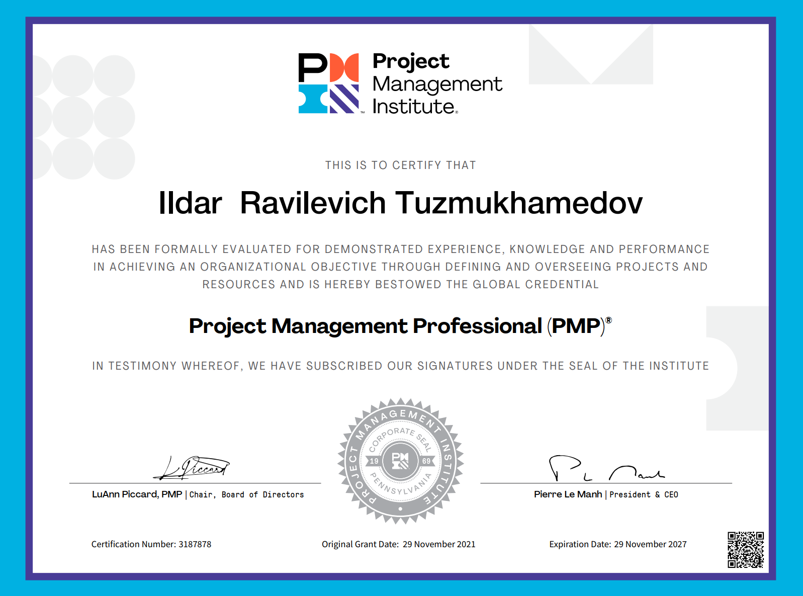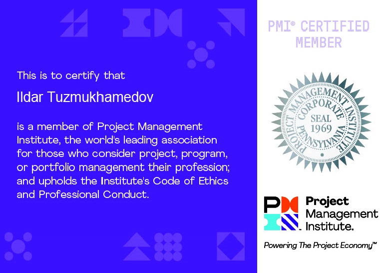PMP (Professional Project Management) certification updated, earned 60 PDUs, renewed till 29 November 2027:
