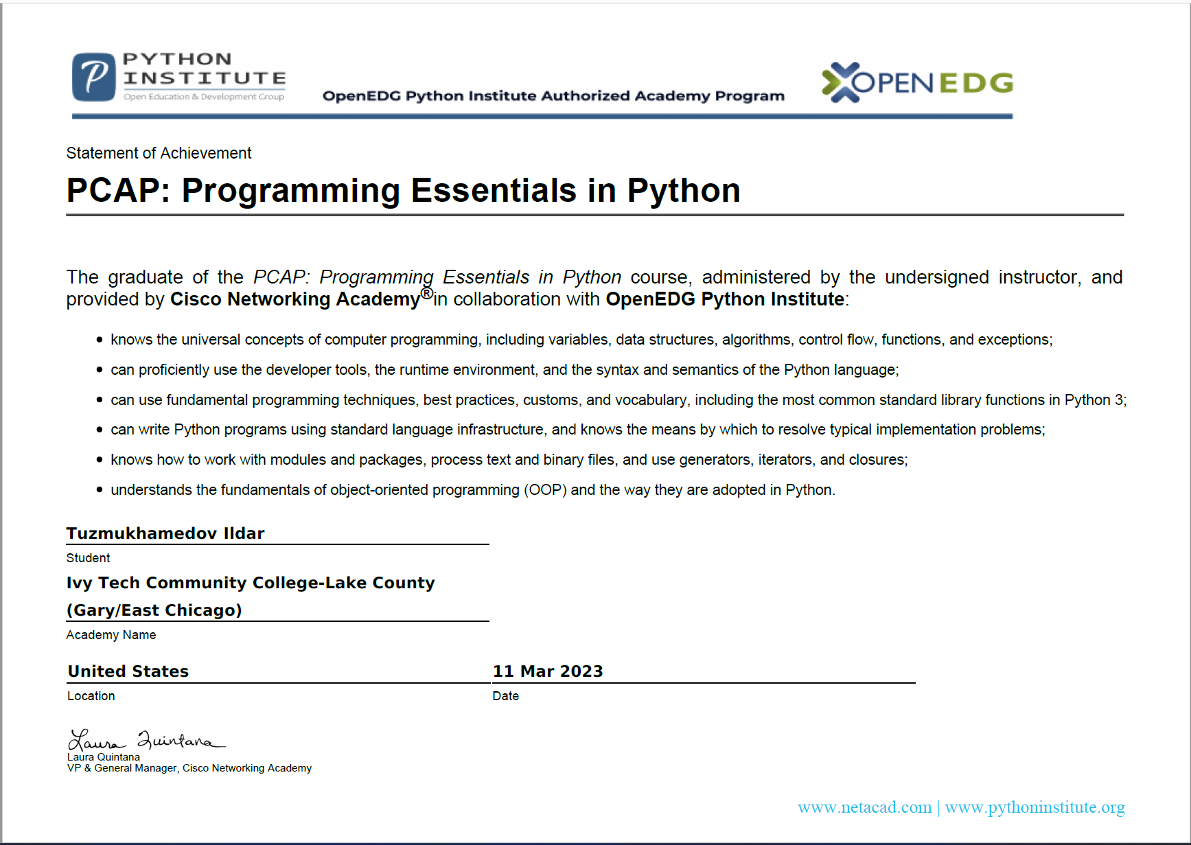 > Mar'13 - Cisco Network Academy course - for Python Associate (PCAP) certification.