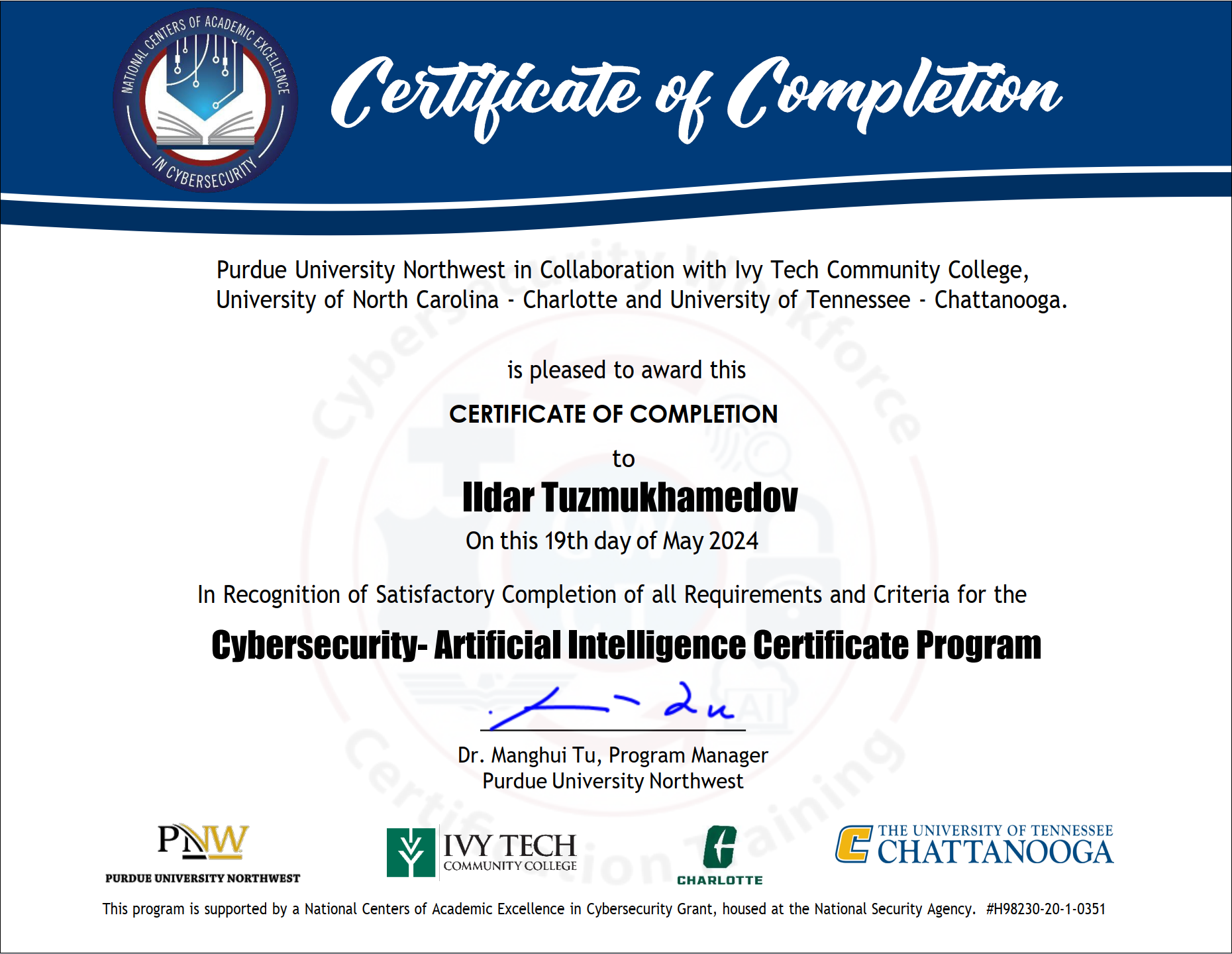 - Cybersecurity Artificial Intelligence certification program, scholarship @ Purdue Northwest & IvyTech (2023, Jan 17 - Mar 12).