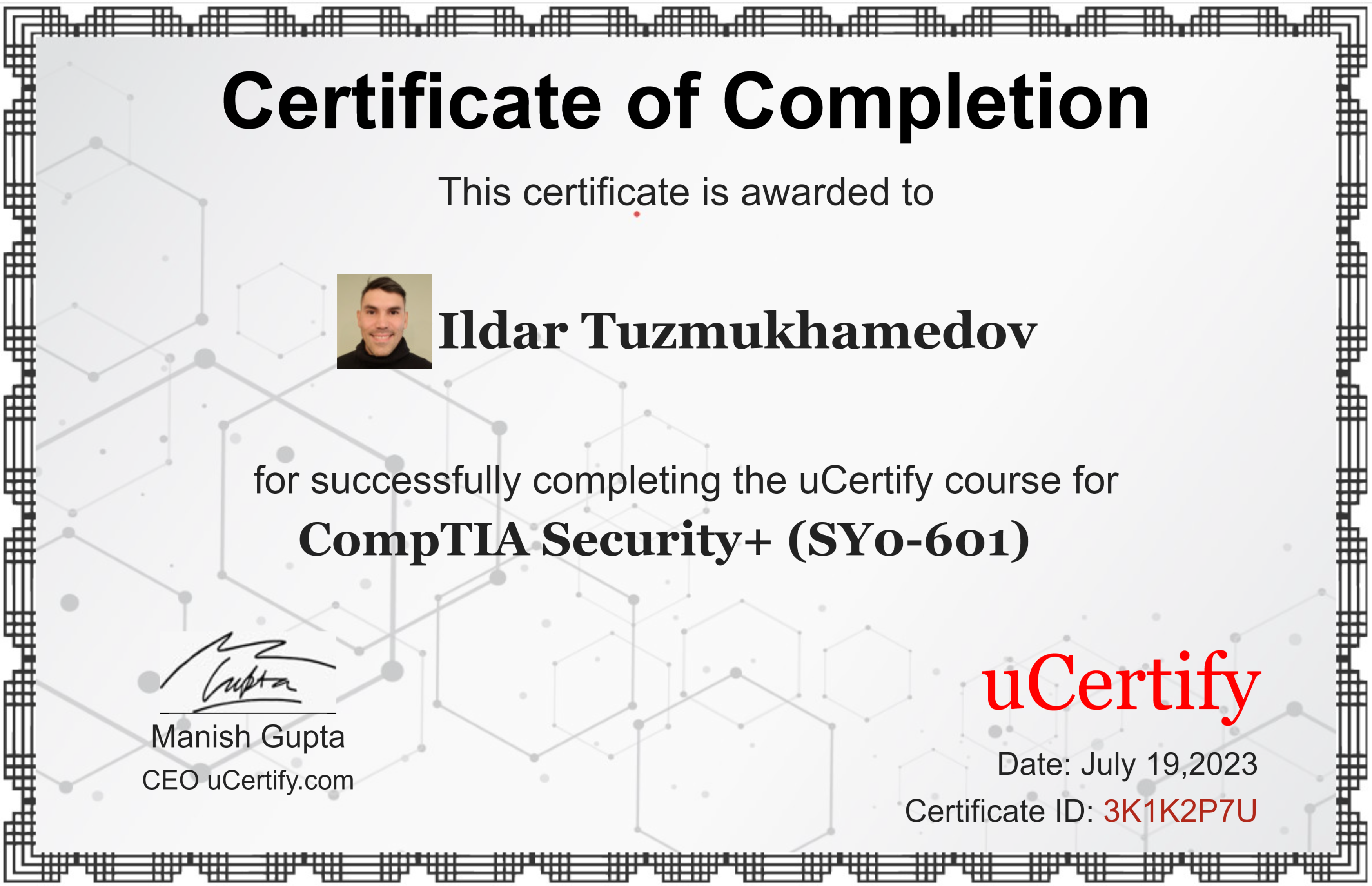 Aug'10 - View my verified achievement from CompTIA, for successfully completing CompTIA Security+ certification.